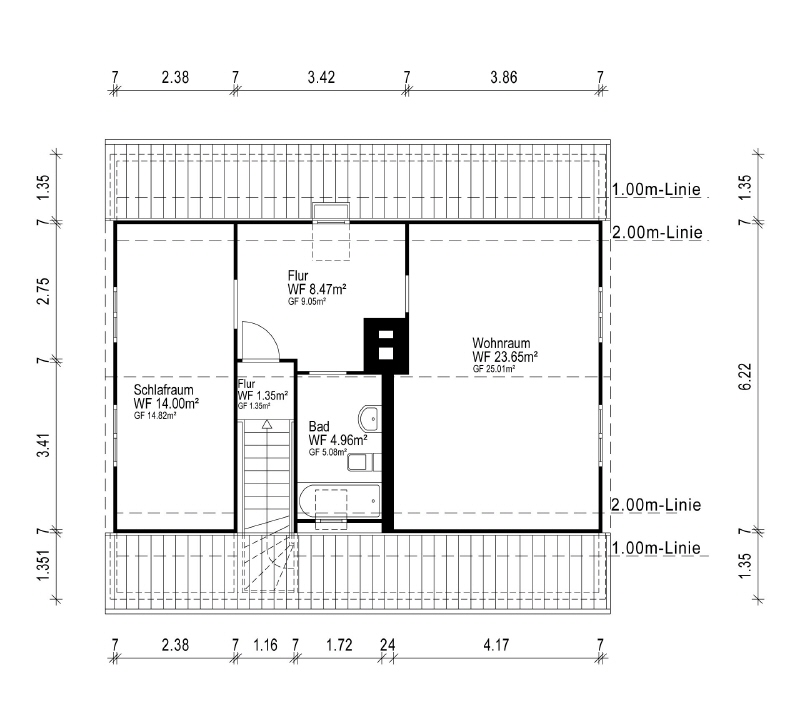 Über eine Treppe erreichen Sie das Dachgeschoss, das durch seine Größe und Aufteilung besonders vielseitig nutzbar ist. Hier erwartet Sie eine zentrale Diele, die bei Bedarf zu einer Küche umgebaut werden kann – entsprechende Anschlüsse sind bereits vorhanden. Zwei großzügige Schlafzimmer bieten dank integrierter begehbarer Kleiderschränke zusätzlichen Komfort und Stauraum.