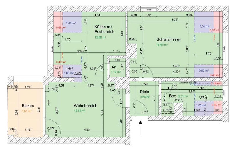 Die Wohnfläche beträgt ca. 64 m², berechnet abzüglich der Dachschrägen, bei einer tatsächlichen Grundfläche von ca. 73 m².
